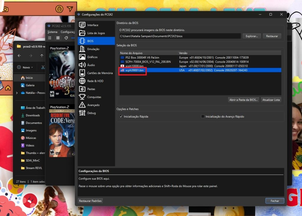Após abrir o emulador pela primeira vez, selecione o idioma português brasileiro (normalmente é o idioma do seu sistema operacional, caso a opção português brasileiro não apareça na lista de idiomas) e, em seleção da BIOS, escolha “scph39001.bin” e prossiga.