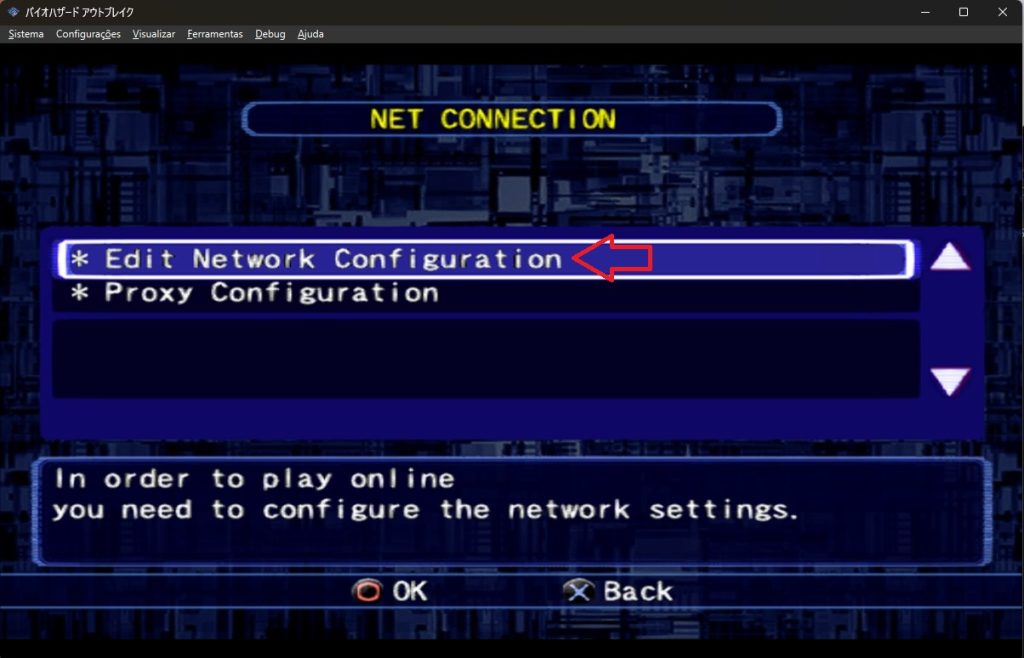 Prossiga até chegar numa janela onde terá 3 opções no meio da tela, selecione “NET CONNECTION” e em “NEXT”. Vá em “Edit Network Configuration” e depois em “Yes”.
