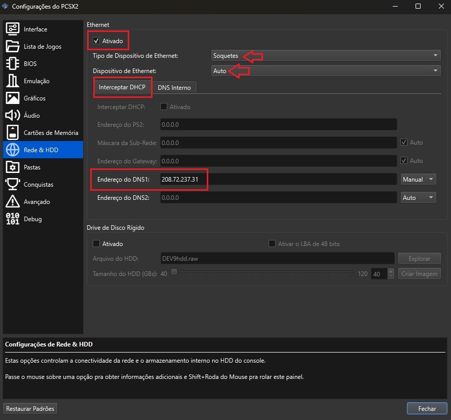 Na janela do emulador, vá na aba “Configurações” e em “Rede & HDD”.