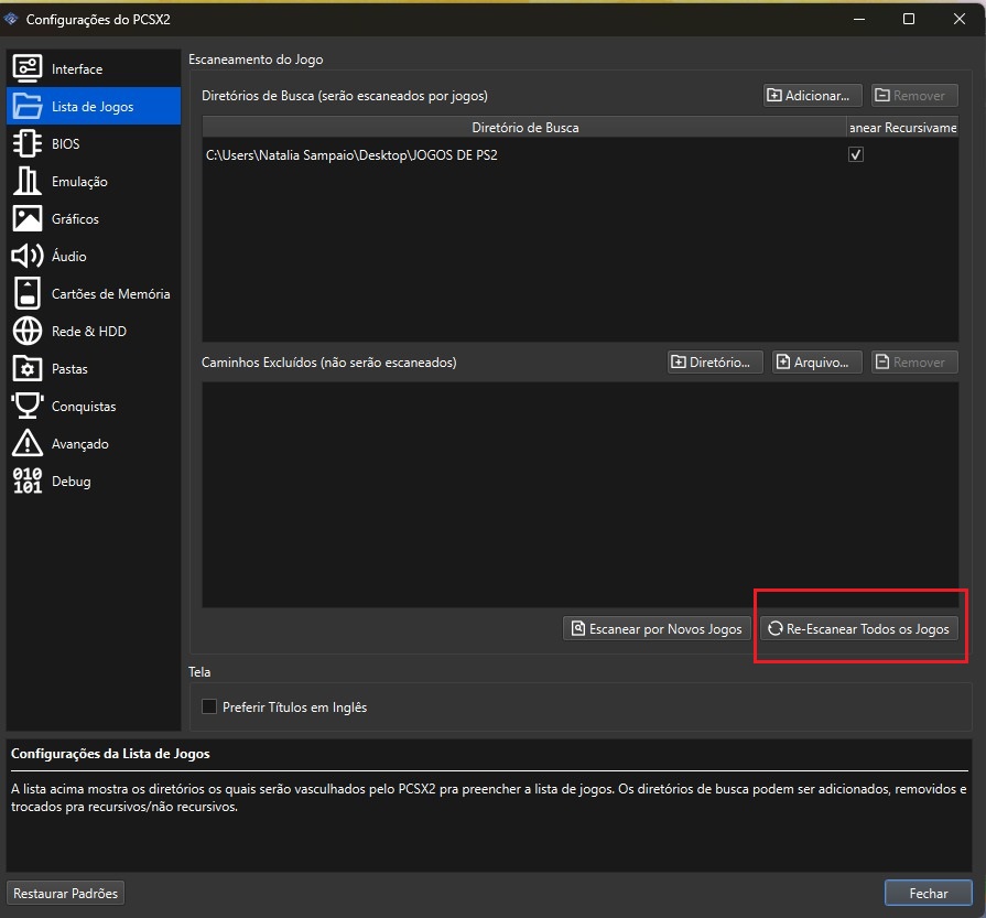 OBS: Antes de iniciar o jogo, coloque os jogos já descompactados na sua pasta de jogos que você escolheu para o emulador. Para verificar se o jogo foi inserido no emulador, basta acessar as opções ‘Configurações’, ‘Lista de Jogos’ e ‘Re-Escanear Todos os jogos’. Tudo dando certo, o jogo vai aparecer na tela principal do emulador.