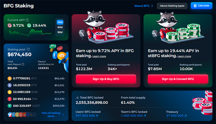 O BFG é o token utilitário da plataforma BetFury, uma das maiores plataformas de apostas cripto. Lançado na Binance Smart Chain, ele serve a várias funções dentro do cassino: desde servir como moeda para jogar slots e jogos de mesa, até habilitar staking e farming com recompensas generosas.