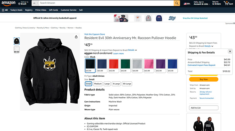 O moletom com capuz de aniversário de Resident Evil sai por US $ 43.99 (cerca de R$ 236), mas com envio e impostos “estimados” pode chegar pela bagatela de US $ 109.21 (cerca de R$ 587). O custo é o mesmo para o de Requiem – é muita grana!