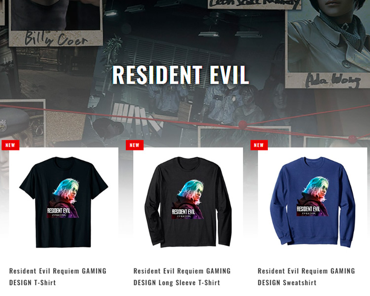 Os mais recentes produtos oficiais de Resident Evil incluem camisetas, blusas e até pelúcias de personagens. Depois da leva de itens comemorativos de 30 anos, a Capcom lançou camisetas e blusas de Resident Evil Requiem e do Raccoon (guaxinim). As pelúcias de Resident Evil Village estão disponíveis exclusivamente em lojas físicas da companhia no Japão, com Chainsaw Man (aldeão com motosserra) e Karl Heisenberg. Um chaveirinho de Ada Wong também apareceu entre as listagens da e-Capcom.