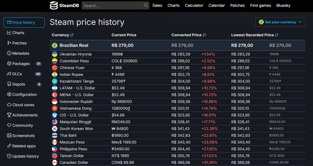 Só de fala de Monster Hunter Wilds, o grande jogo da Capcom do momento. E uma curiosidade muito bem-vinda que talvez você não saiba: o preço do jogo no Brasil é o menor do mundo. Ao menos no Steam, esta é uma realidade, de acordo com o histórico de preços do site SteamDB. A versão base do novo Monster Hunter é comercializada aos brasileiros por R$ 279,00.