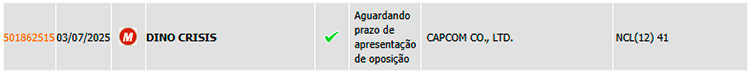 Já em relação à Dino Crisis, a minha esperança é maior. O registro é de 3 de julho de 2025, com uma petição de 8 de julho que não seguiu em frente e outra de 12 de agosto que está em “prazo de apresentação de oposição”. A classe do INPI Brasil é a mesma de uma das de Requiem, de entretenimento e com especificação para “jogos de videogame”, entre outras mais. A DANADA DA CAPCOM TEM UM NOVO DINO CRISIS? EU QUERO ACREDITAR!