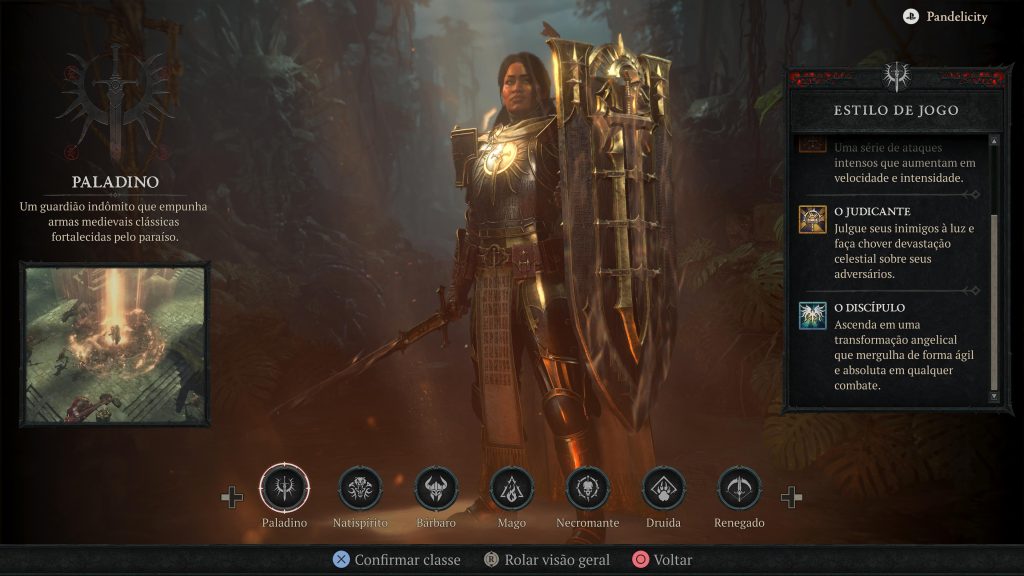 Resumindo bem o Paladino dentro de Diablo IV, ele é a classe que vai aguentar bastante dano físico e alguns danos elementais, ajudando também a dar buff (efeitos positivos) aos seus aliados (caso esteja jogando cooperativo) e usando suas habilidades de cura e purificação para retirar os debuffs (efeitos negativos que o personagem e/ou seus aliados venha a sofrer), sendo o classe essencial para se jogar em grupo – o famoso suporte.