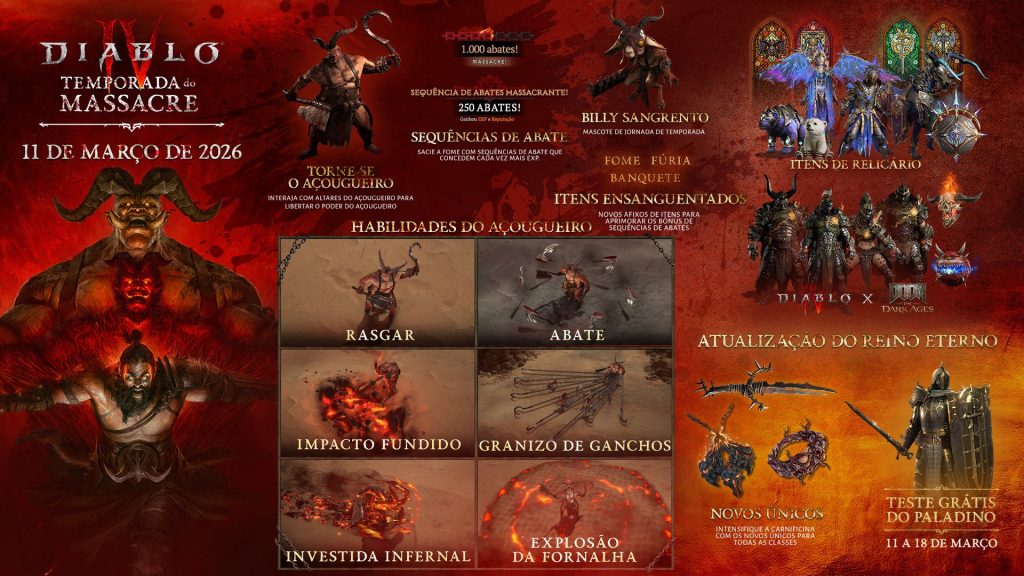 Iniciada no dia 11 de março de 2026, a Temporada do Massacre leva o Viajante a conhecer o demonologista Khulrami, que afirma ter conseguido canalizar os poderes demoníacos para ser usado tanto resistir aos poderes de Mefisto, quanto para amplificar os poderes do Viajante e, assim, ter uma vantagem a mais contra esse Mal Maior. Com isso, conseguimos nos tornar um dos inimigos mais icônicos em Diablo IV: o Açougueiro.