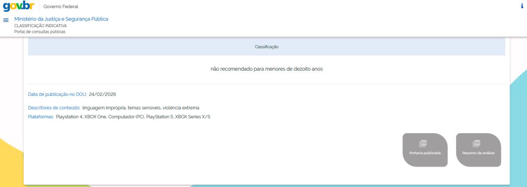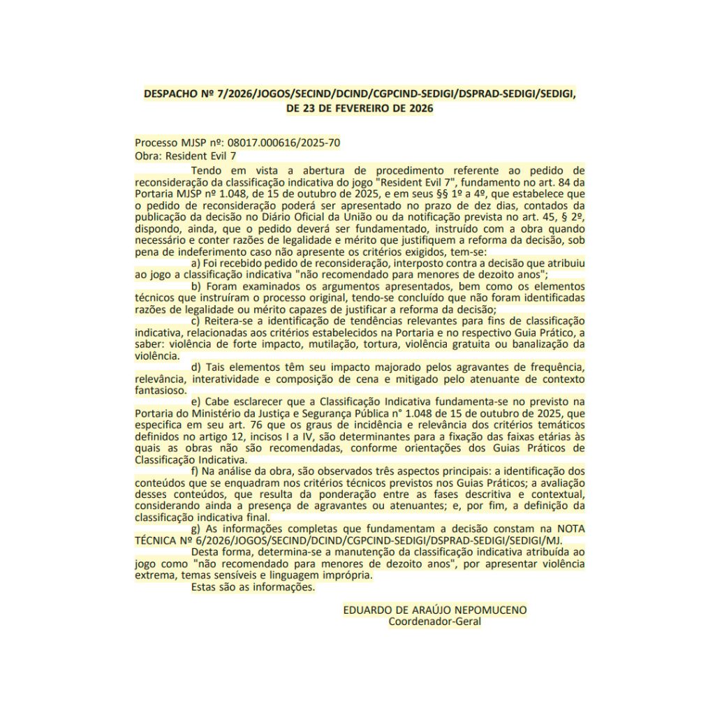 Em um despacho datado do dia 23, mas publicado no Diário Oficial da União do dia 24 de fevereiro, Eduardo de Araújo Nepomuceno, Coordenador-Geral de Política de Classificação Indicativa, determinou a manutenção da classificação atribuída pela entidade brasileira devido ao jogo apresentar “violência extrema”, “temas sensíveis” e “linguagem imprópria”.