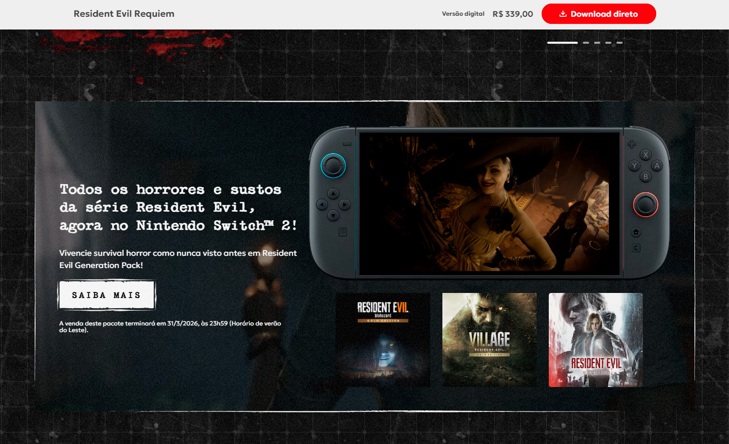 A Capcom lançou uma atualização para a versão de Resident Evil Requiem do Nintendo Switch 2. Foram solucionados problemas que bloqueavam o progresso do jogador em condições específicas e também aplicadas correções para melhorar a jogabilidade geral. As situações estão listadas na página do jogo.