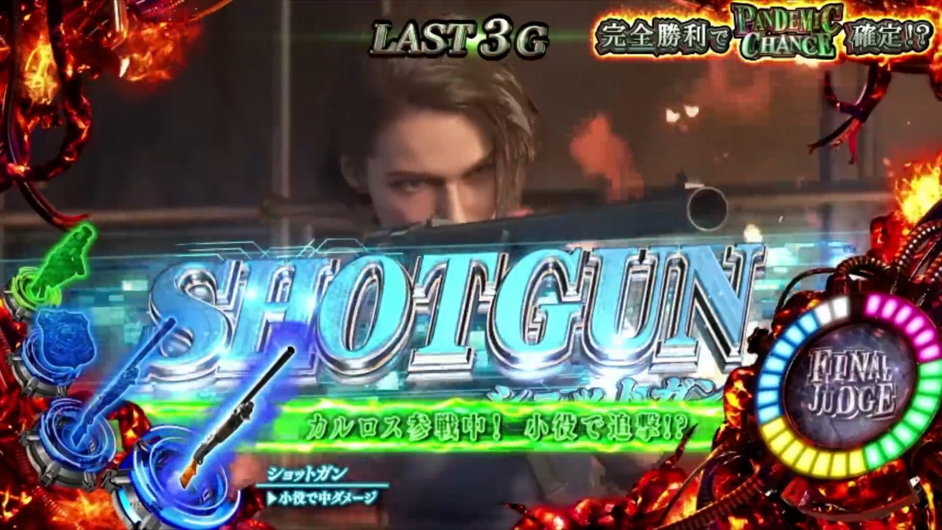 Em momentos específicos, há algumas chances de bônus que podem ser aproveitadas, a exemplo do “Pandemic Chance” com pontos de “G Virus” e um “Pandemic Bonus” com o inédito “D Virus”. Neste smart pachislot, o Nemesis de Resident Evil 3 é o fator principal de sorte e pode levar a um “Super Pandemic Bonus” combinando combos com “D Virus”, além do “M Virus” e do “S Virus” criados para dinâmicas da máquina. Um “Premium Pandemic Bonus” é outro que aparece em um novo ambiente “RE: Birth”. “Inferno Chance” e um “I Virus” também estão entre as jogadas.