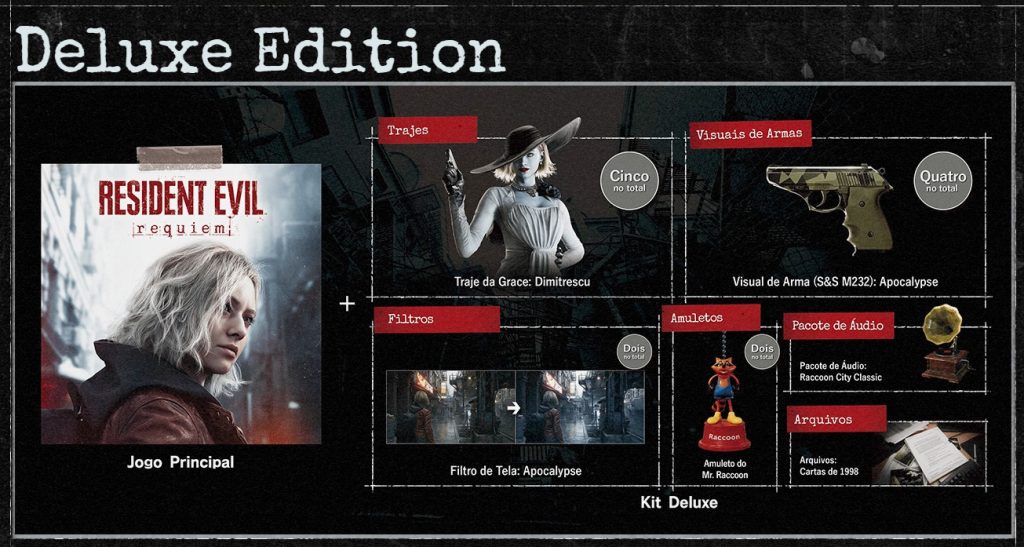 Ainda em território japonês, Capcom terá uma Collector’s Edition em uma caixa especial, jogo em mídia física (Deluxe Edition), steelbook e acrílico de Grace Ashcroft para PlayStation 5 e Nintendo Switch 2. O preço é de 12.500 ienes (cerca de R$ 440) via e-Capcom.