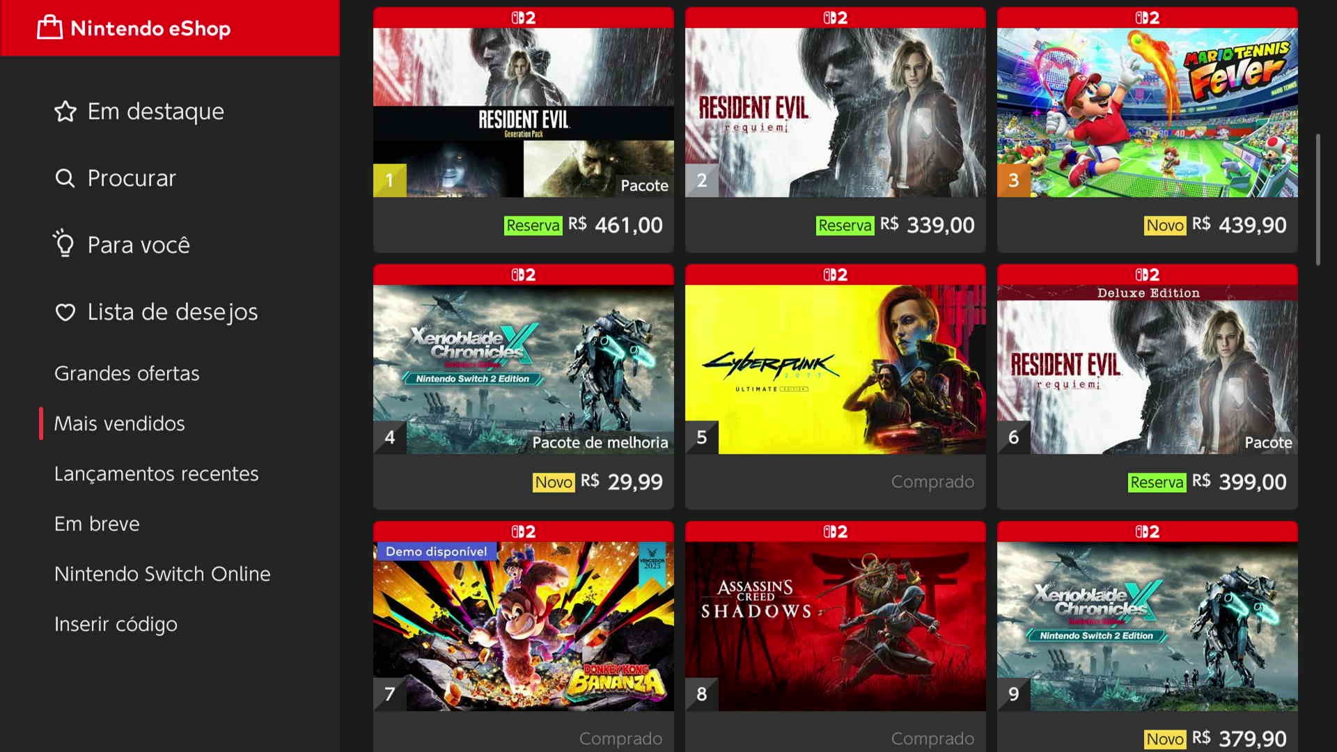Resident Evil Requiem vai ser lançado no Brasil digitalmente no dia 27 de fevereiro, data global do jogo. Na eShop, a versão base sai por R$ 339,00 e a Deluxe Edition por R$ 399,00. O Resident Evil Generation Pack, que conta com a base de Requiem e também com Resident Evil Village e Resident Evil 7, é outra opção por R$ 461,00 (R$ 153,66/cada jogo). É justamente o conjunto o mais procurado no Switch 2.