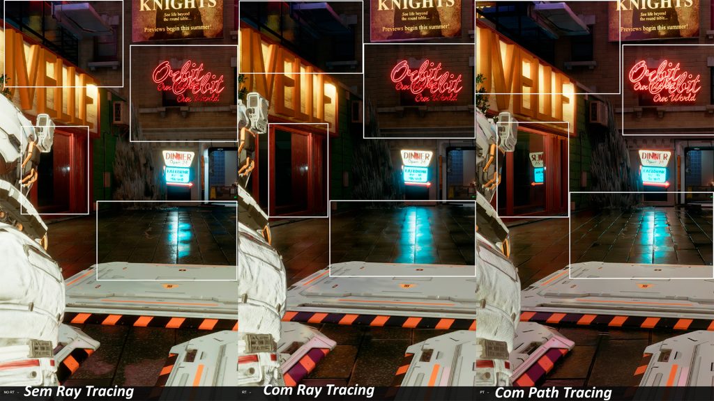 É possível evidenciar que, na versão sem RT, o reflexo do letreiro “Dinner” no chão aparece pixelado e mais contido em como a luz se espalha. Já com o Ray Tracing ligado, o efeito dissipa melhor, reduzindo os pixelamento e trazendo um aspecto mais espelhado ao chão.