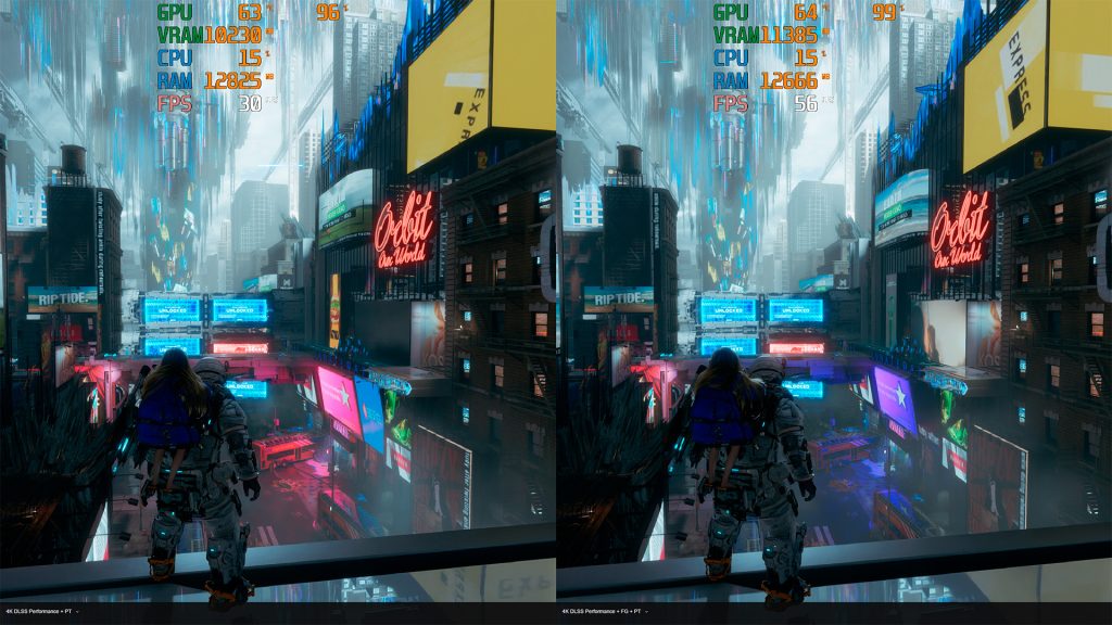Porém vale lembrar que essa é a parte mais pesada que encontrei no jogo. Quando descemos ali para baixo na rua, temos um ganho de FPS que sobe para 60~80 dependendo da parte com Path Tracing, e ao decorrer do jogo tive uma média de 65~75 FPS +-. Ou seja, é sim possível jogar o jogo com Path Tracing em uma RTX 4070 Super em 4K!
