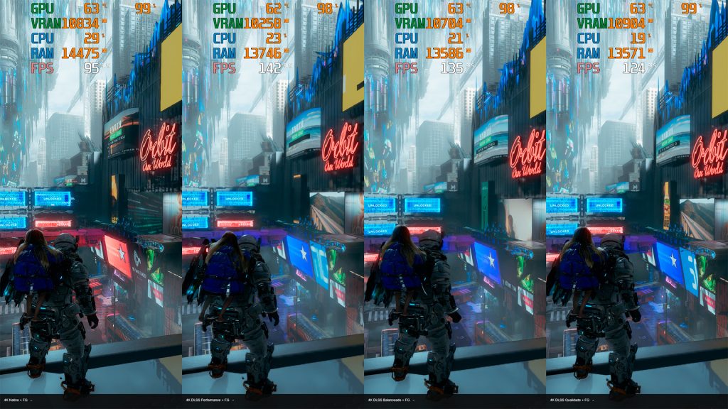 Acredito que, em 4K com RT nessa placa utilizada, o ideal é que você utilize pelo menos o DLSS em Qualidade, pois ele consegue manter 60 FPS consistentes do começo ao fim.