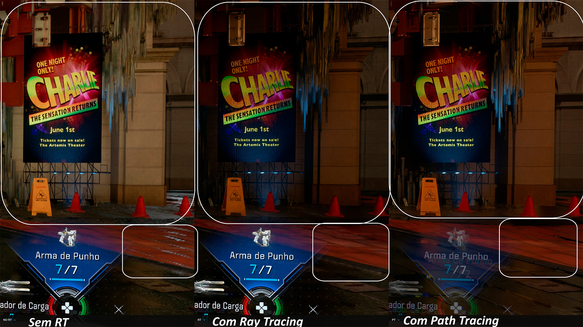 Esses mesmos pontos se repetem quando observamos outros cantos da imagem. O chão apresenta reflexos pixelados e pouco realistas na versão sem RT, enquanto as versões com Ray Tracing e Path Tracing entregam uma fidelidade superior.