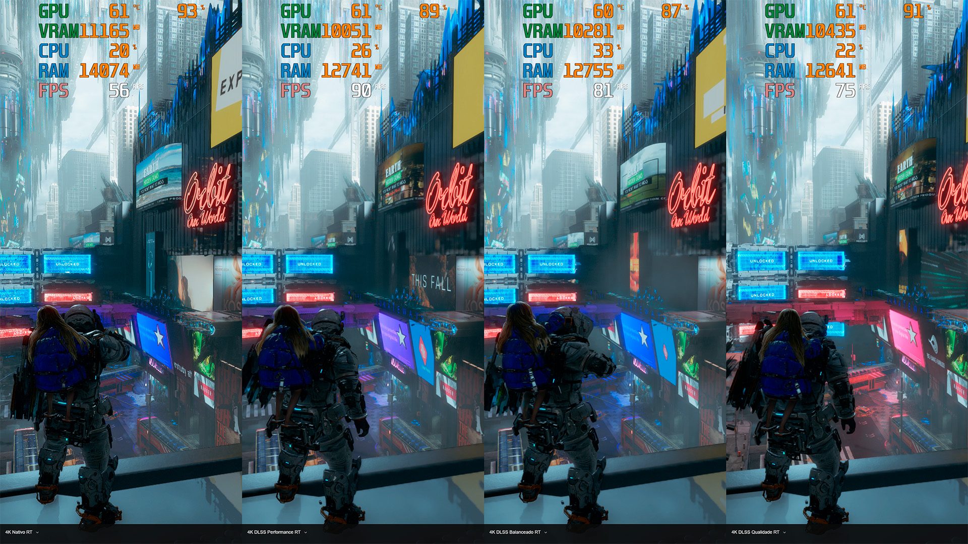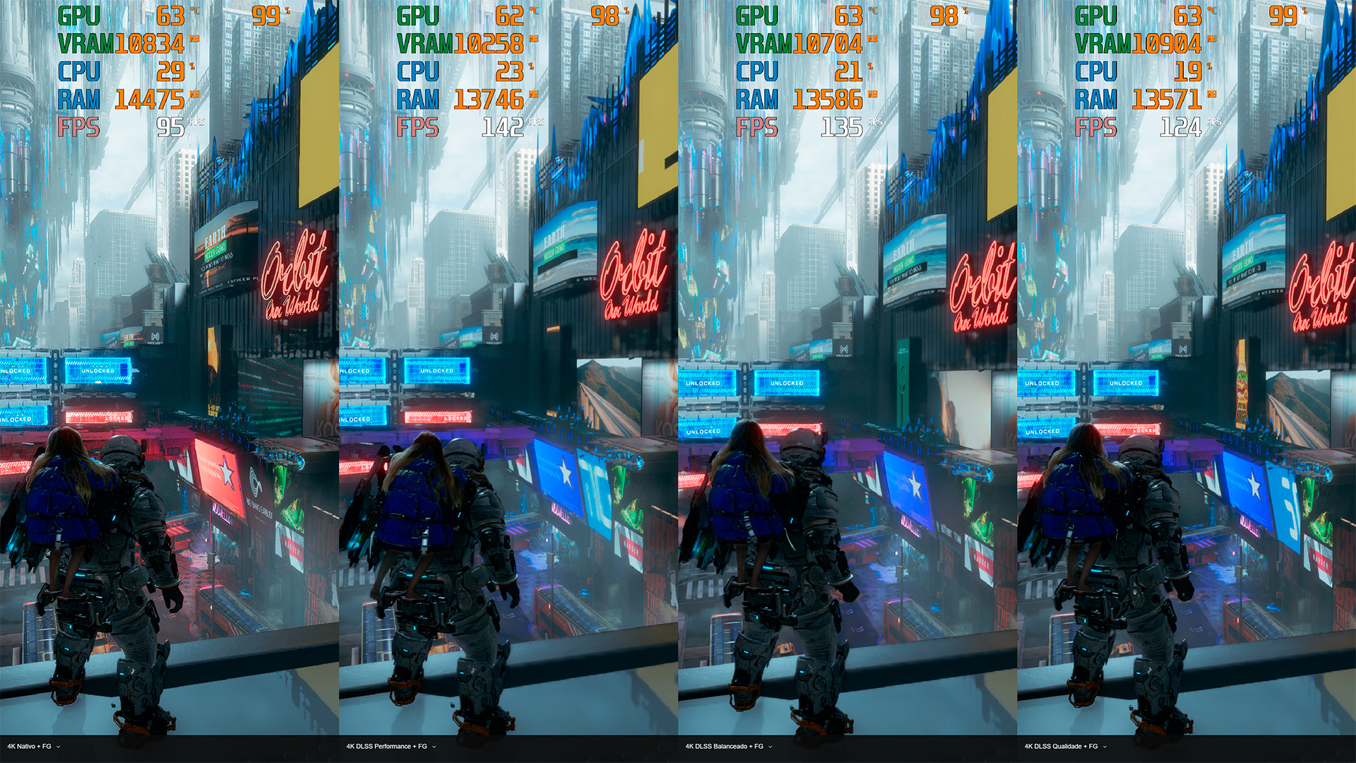 Acredito que, em 4K com RT nessa placa utilizada, o ideal é que você utilize pelo menos o DLSS em Qualidade, pois ele consegue manter 60 FPS consistentes do começo ao fim.