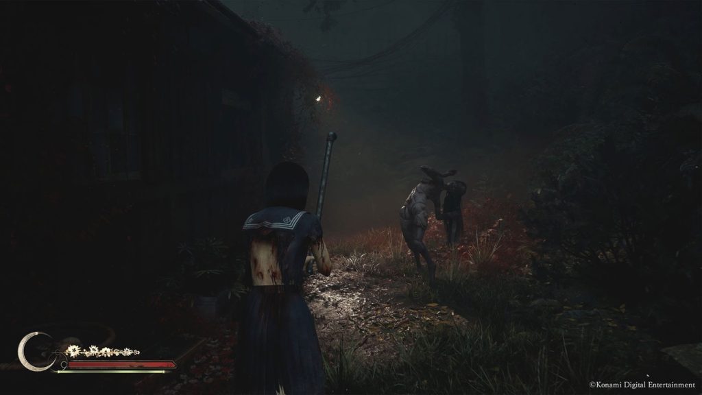 Curiosamente, não existe armas de fogo em Silent Hill f — tudo é corpo a corpo, sendo coerente com o contexto e época. Hinako usa diferentes armas de uso limitado (canos de aço, tacos, machados etc.), com ataques leves e pesados que consomem estamina. Esse “vigor” também pode ser usado para esquivar para qualquer direção. Acima da barra de vida está o medidor de sanidade — segurando L2, você entra no modo foco, que permite contra-ataques e golpes carregados que atordoam os inimigos.