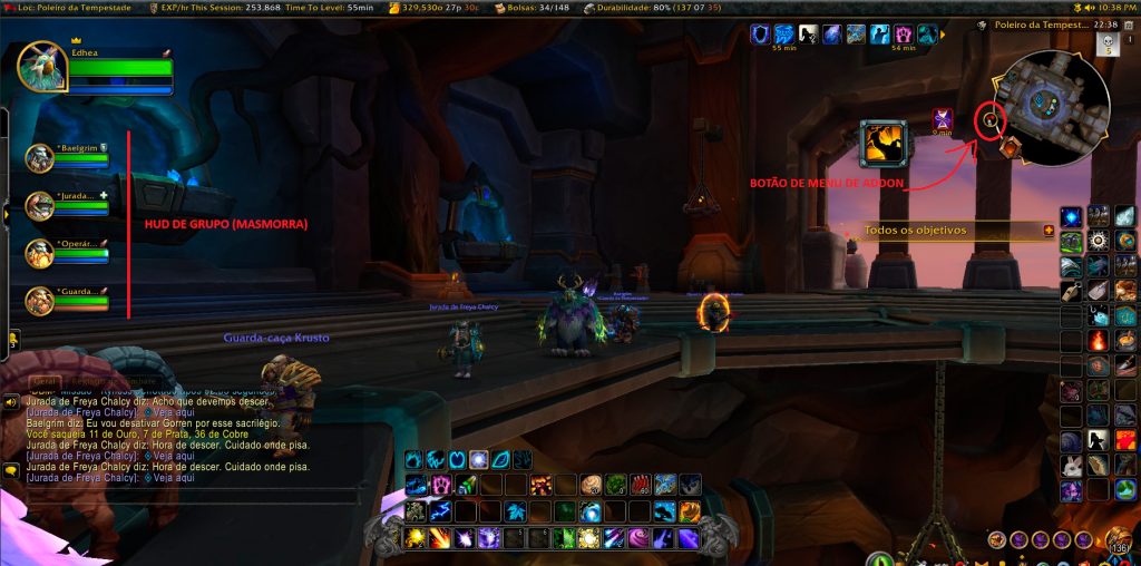 Sobre a incorporação dos addons na interface, como raios isso funciona?? Calma que te explico! Para quem tá ambientado nos MMORPGs, sabe que tem uns aplicativos, criados pela comunidade, que colocamos no jogo para aumentar a customização de jogabilidade, coisa que, no caso do WoW, nunca foi o seu forte. Os utilitários dos addons variam de acordo com a sua funcionalidade, desde a customização dos name plates, bolsas, casa de leilão e cartografia. Podem até auxiliar de combate, com medidores de dano, tempo de recarga e aviso de perigo nos chefes de masmorra e raid, por exemplo.