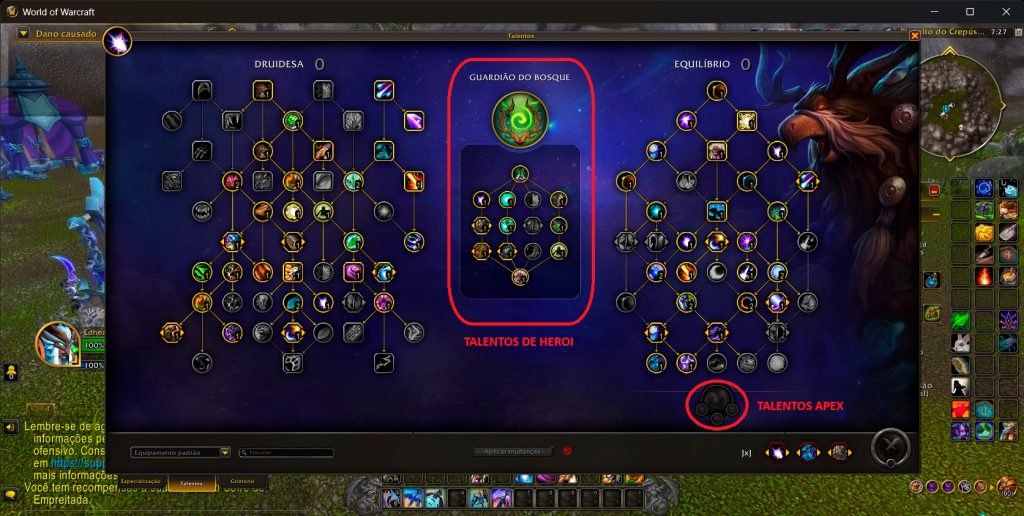 Sobre os talentos APEX, eles funcionam de forma semelhante aos talentos de herói, introduzidos em TWW, nos quais há uma pequena “ramificação” abaixo dos seus talentos de classe para dar um boost às suas habilidades na árvore de especialização. Vou dar um exemplo da minha main char, a druida, mas a lógica vale para todos os personagens do seu bando de guerra. Toda classe tem sua árvore de talentos dividida em duas partes, a da classe em si e a da especialização. À parte de que a escolha da especialização influencia e quais talentos heroicos estarão disponíveis para escolha (com duas opções que, no caso da minha especialização – Equilíbrio -, são ‘Escolhido de Eluna’ e ‘Guardião do Bosque’), os talentos APEX funcionam, basicamente, como um reforço aos seus talentos de herói. Legal, né?