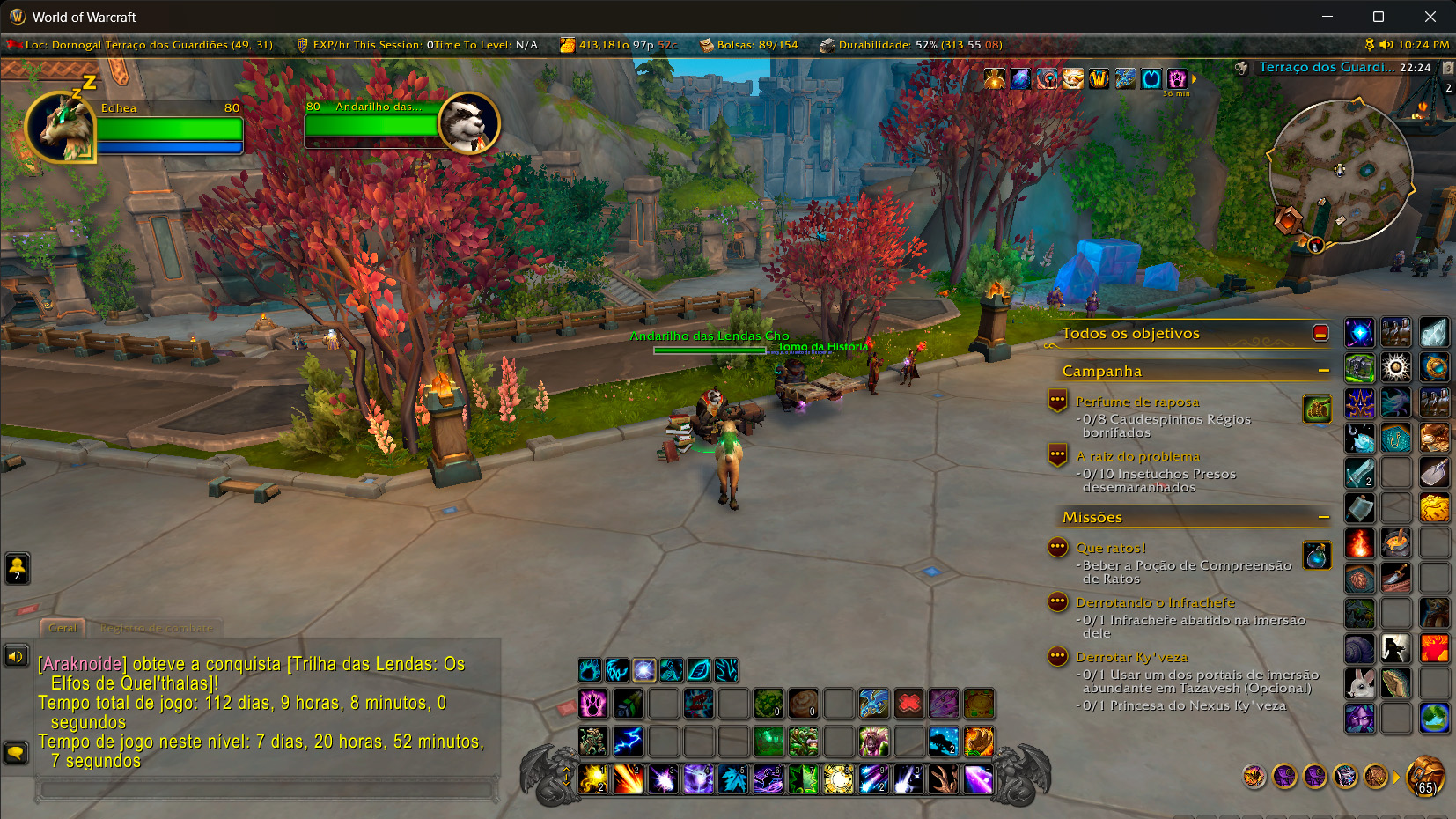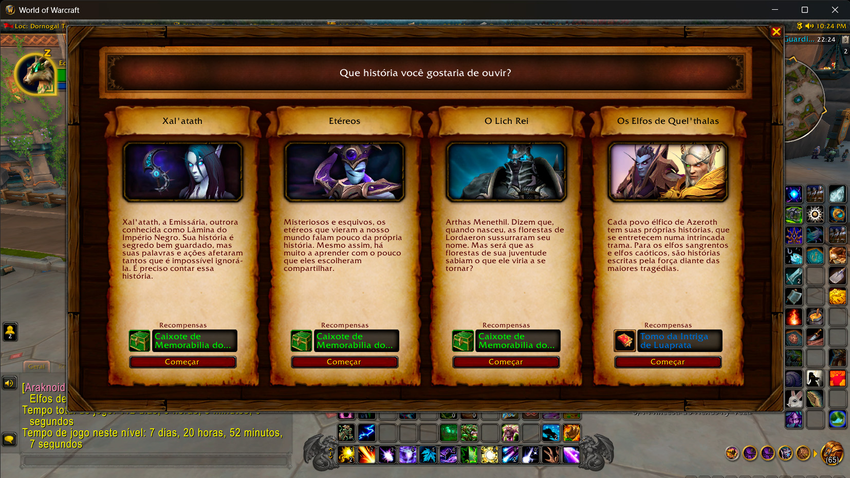 Já em Dornogal, há duas opções: ou você faz a questline normal de TWW ou pode fazer a Jornada da Relembrança, que consiste em procurar o Andarilho das Lendas Cho (Lorewalker Cho). Com ele, é possível revisitar algumas das histórias marcantes na lore de WoW, como a do Lich King, dos Etéreos (povo que liga TWW a Midnight, mas que já estava presente na franquia desde Burning Crusade), da própria Xal’athat e a história dos Elfos Sangrentos e Elfos Caóticos.