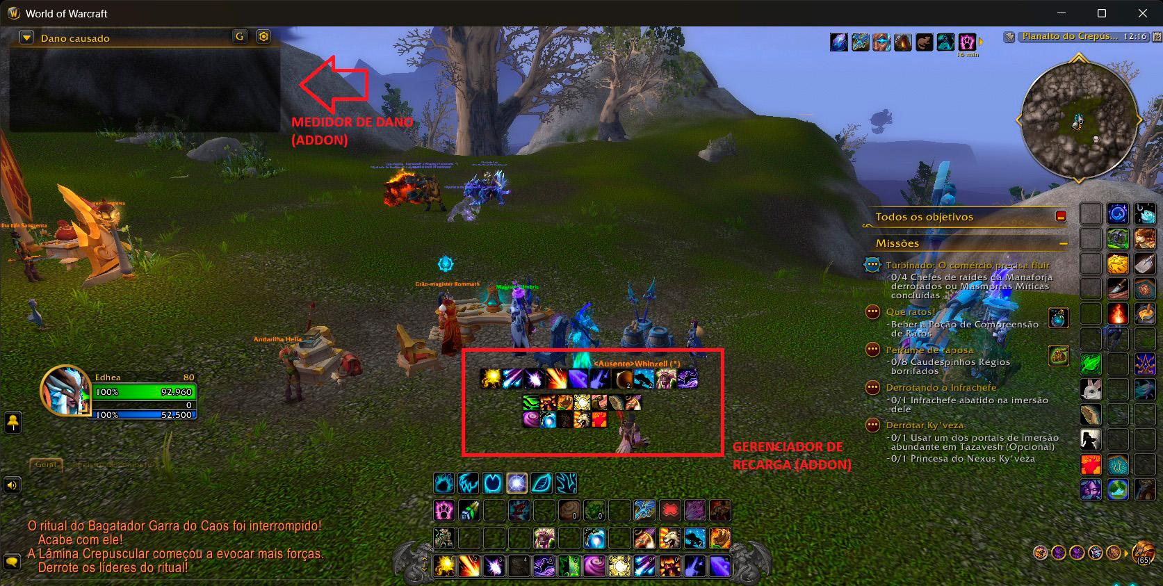 Sobre a incorporação dos addons na interface, como raios isso funciona?? Calma que te explico! Para quem tá ambientado nos MMORPGs, sabe que tem uns aplicativos, criados pela comunidade, que colocamos no jogo para aumentar a customização de jogabilidade, coisa que, no caso do WoW, nunca foi o seu forte. Os utilitários dos addons variam de acordo com a sua funcionalidade, desde a customização dos name plates, bolsas, casa de leilão e cartografia. Podem até auxiliar de combate, com medidores de dano, tempo de recarga e aviso de perigo nos chefes de masmorra e raid, por exemplo.