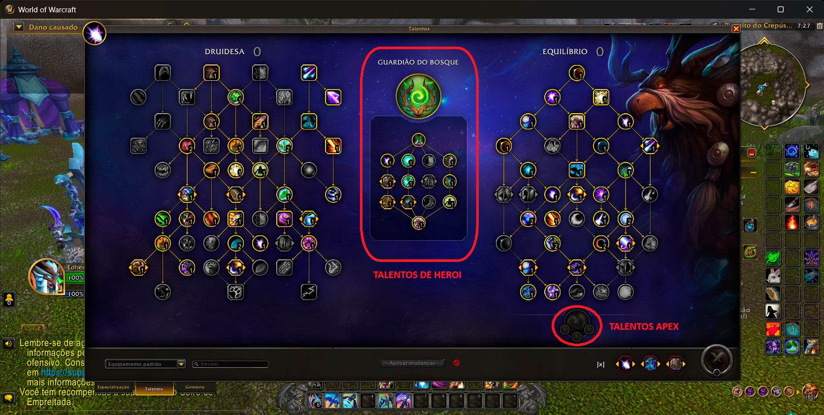 Sobre os talentos APEX, eles funcionam de forma semelhante aos talentos de herói, introduzidos em TWW, nos quais há uma pequena “ramificação” abaixo dos seus talentos de classe para dar um boost às suas habilidades na árvore de especialização. Vou dar um exemplo da minha main char, a druida, mas a lógica vale para todos os personagens do seu bando de guerra. Toda classe tem sua árvore de talentos dividida em duas partes, a da classe em si e a da especialização. À parte de que a escolha da especialização influencia e quais talentos heroicos estarão disponíveis para escolha (com duas opções que, no caso da minha especialização – Equilíbrio -, são ‘Escolhido de Eluna’ e ‘Guardião do Bosque’), os talentos APEX funcionam, basicamente, como um reforço aos seus talentos de herói. Legal, né?