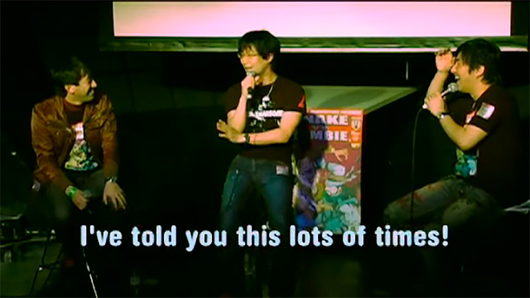 Após risadas da plateia e do próprio Mikami, Hideo Kojima comentou como há ideias que são tão fora da caixinha que, muitas vezes, as pessoas pensam que ele as diz apenas para ser engraçado e consequentemente são ignoradas — mas, na verdade, ele fala sério.